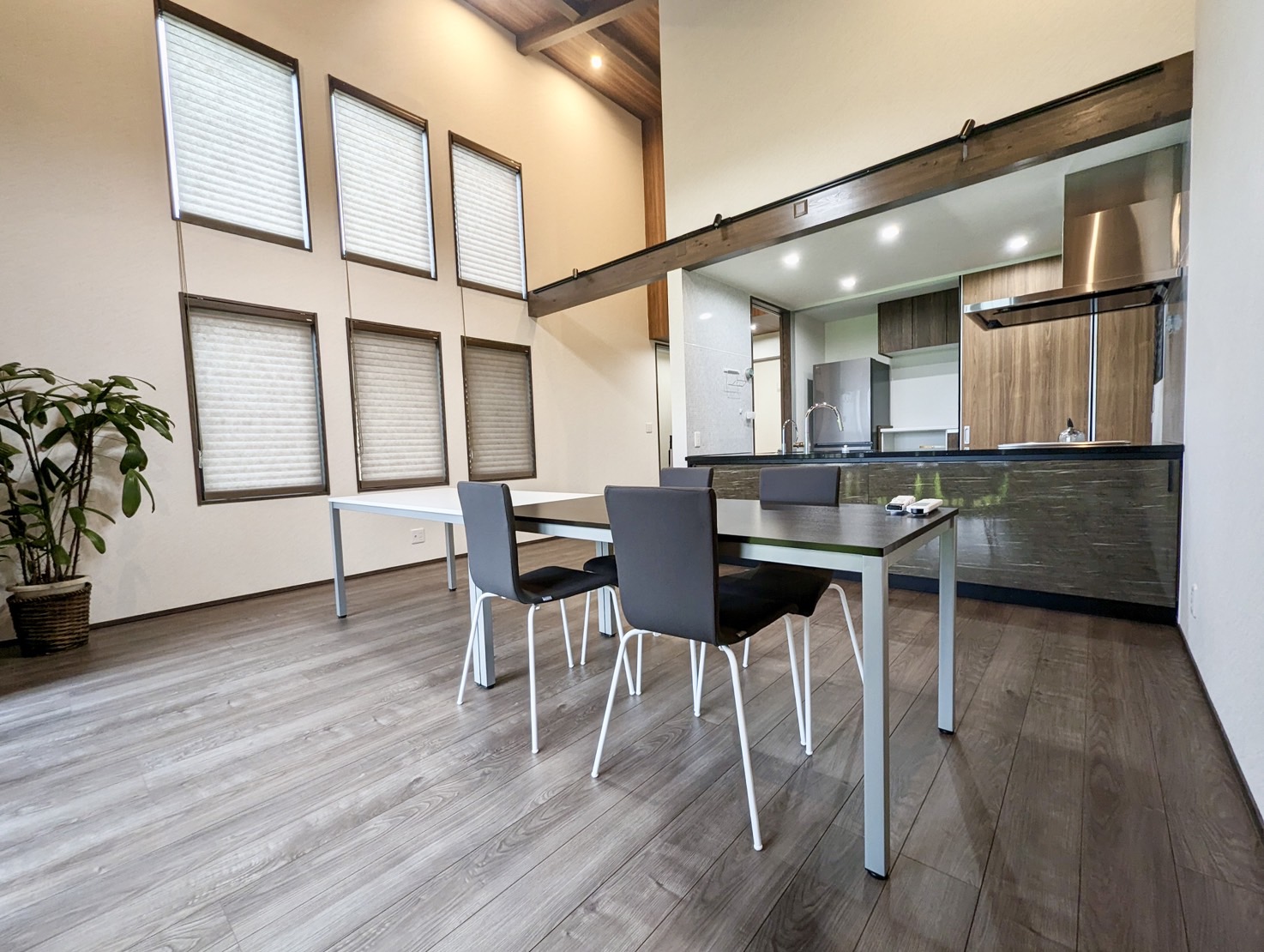 まず目を引くのは、リビングの広々とした吹き抜け空間です。